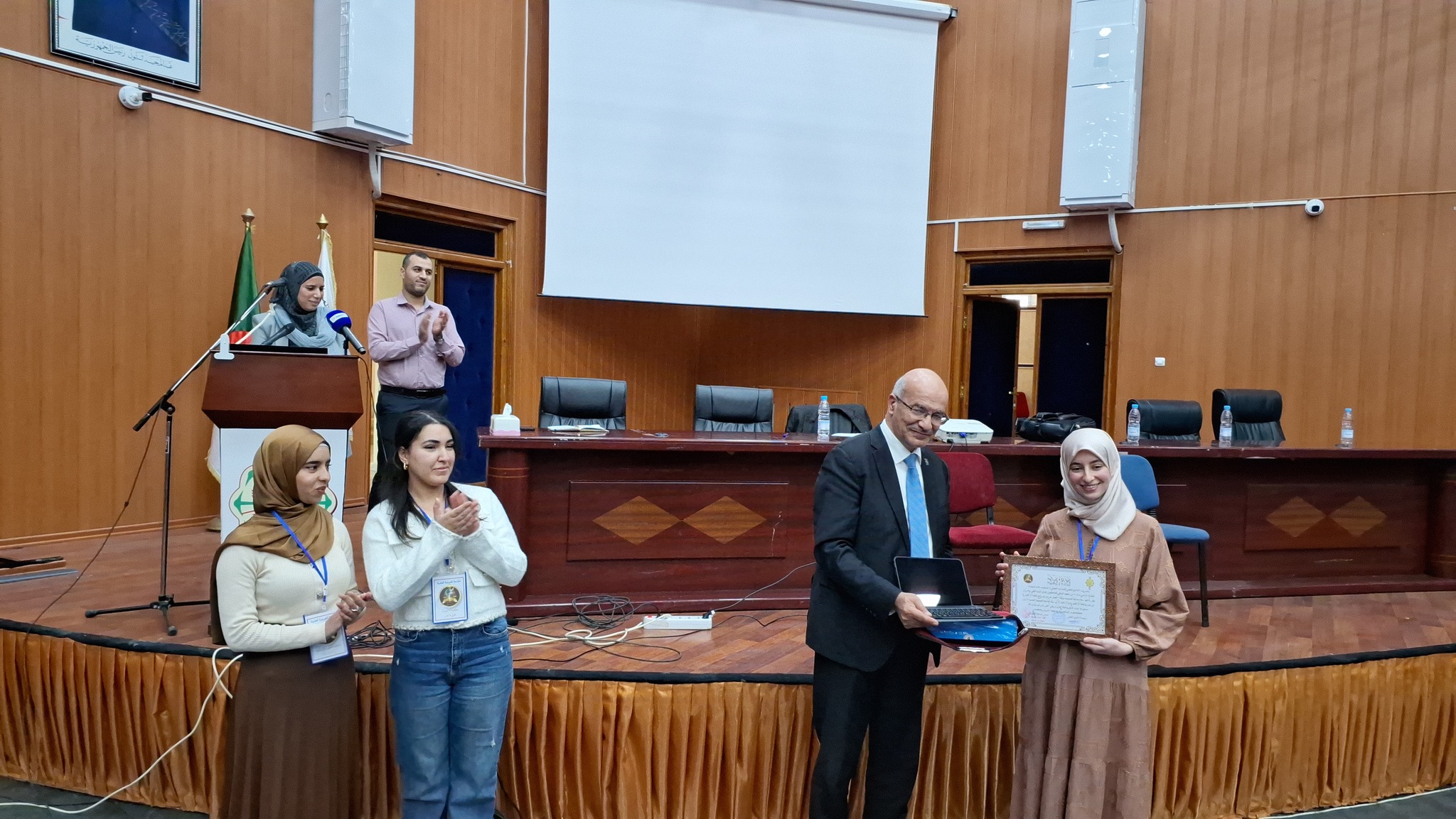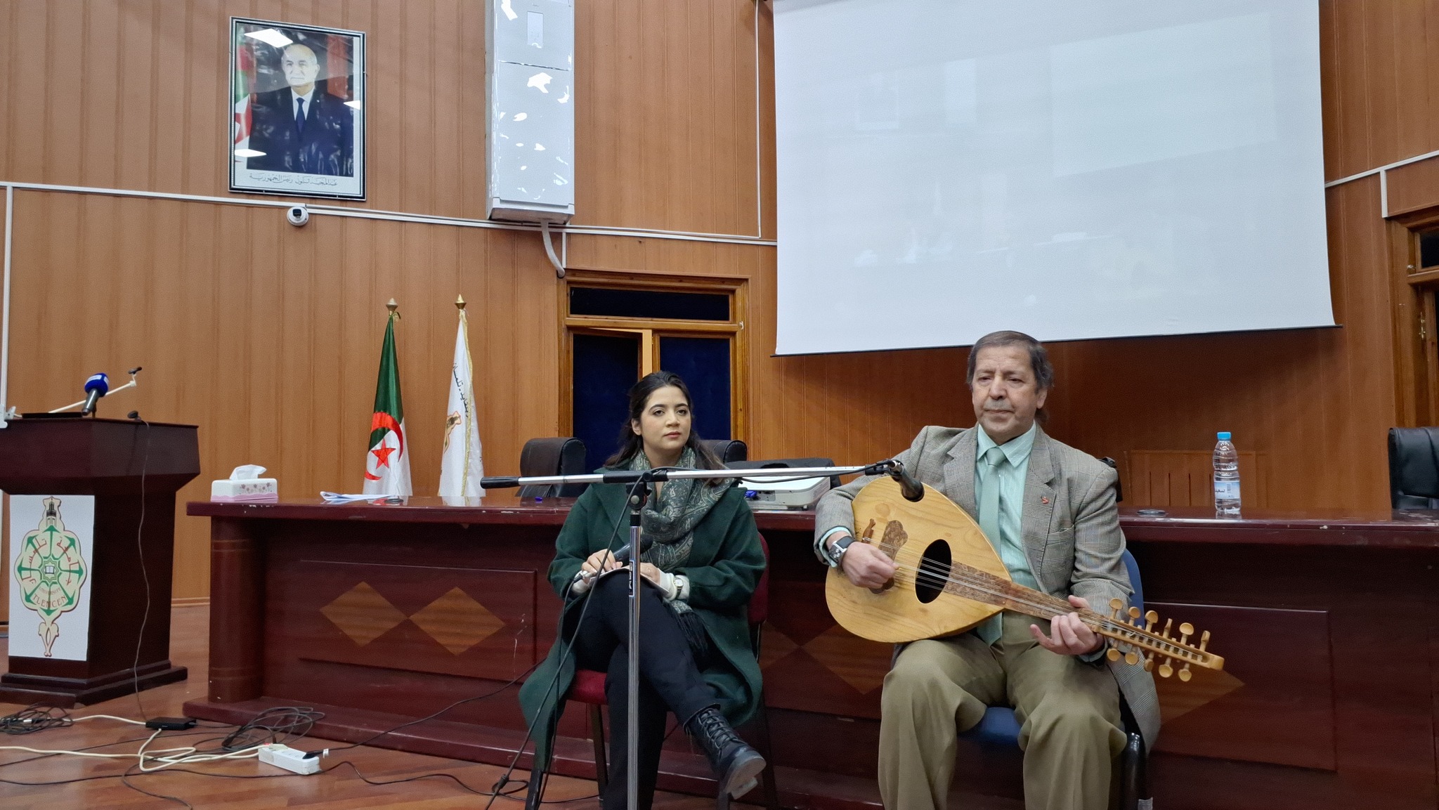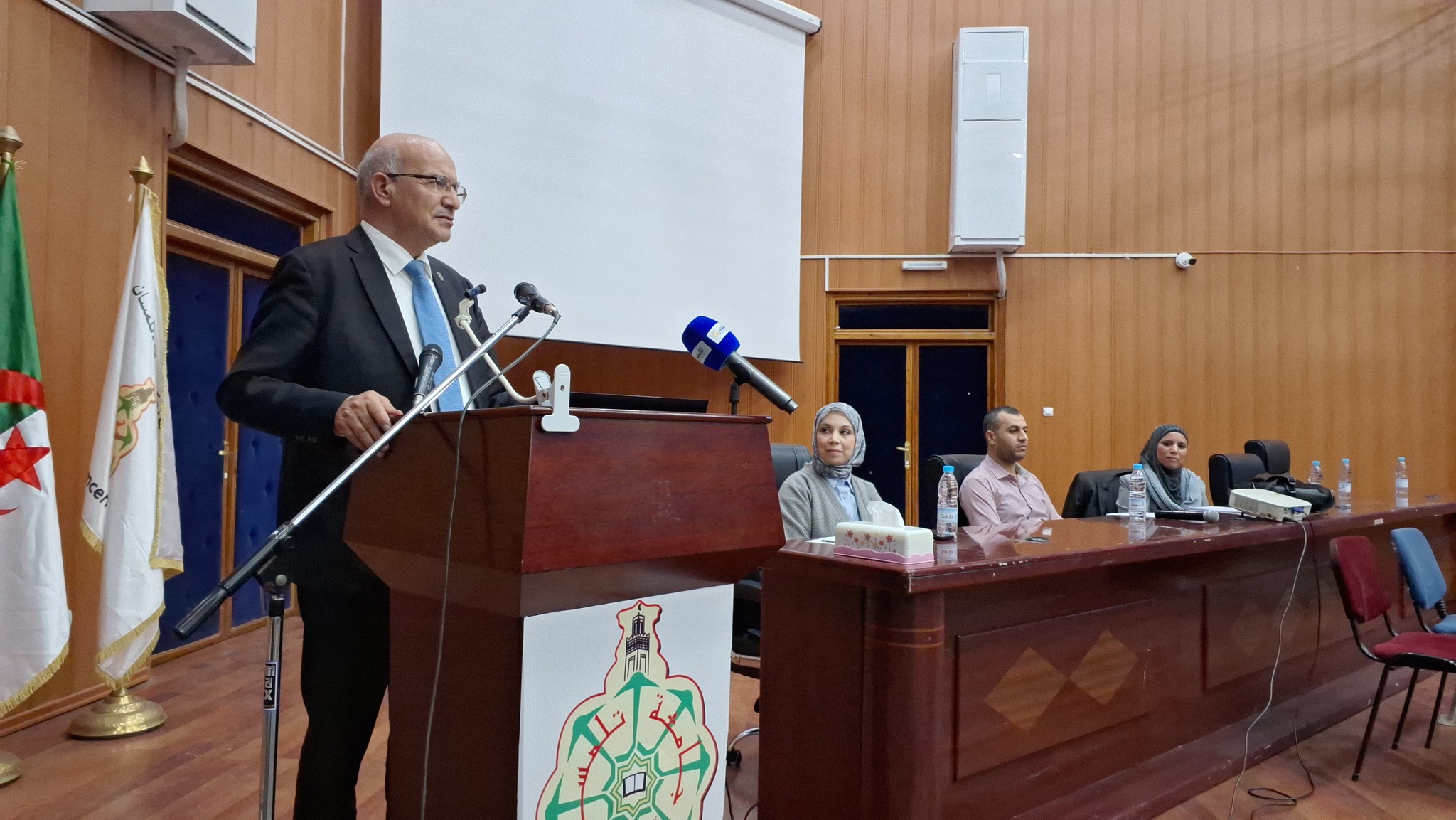 The event took place at the Conference Hall of the Faculty of Foreign Languages, in the presence of Prof. Abderrahmane Kherbouche, Dean of the Faculty of Letters and Languages; Mr. Ben Aïssa Azzedine, Assistant Dean; Mrs. Wasilla Mouro, Dean of the Faculty of Foreign Languages; as well as several faculty supervisors and students from various disciplines.