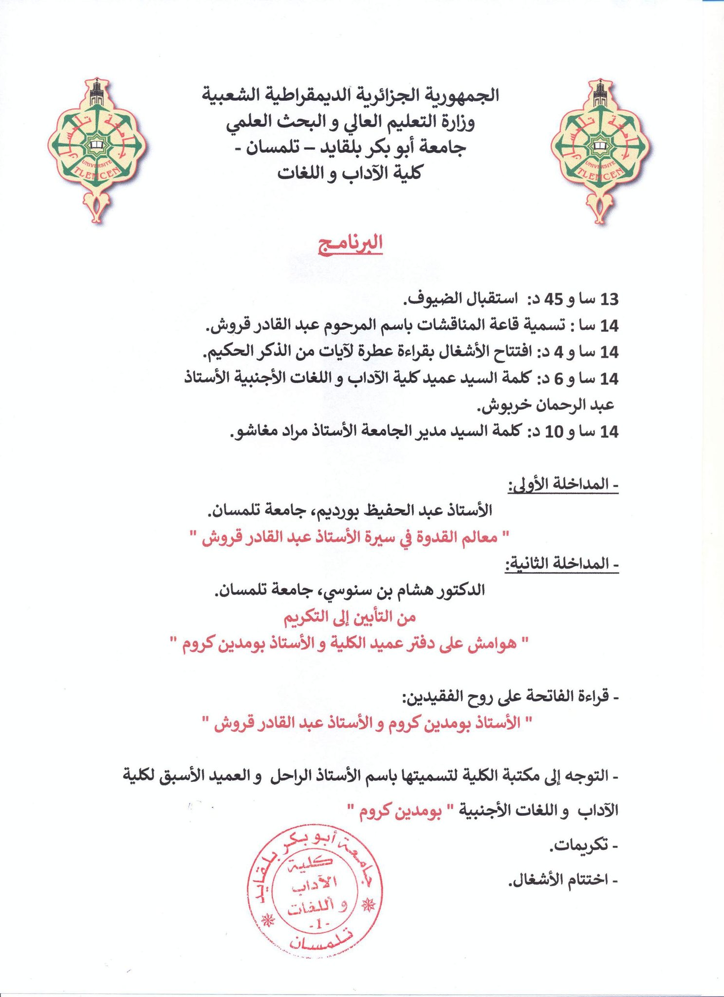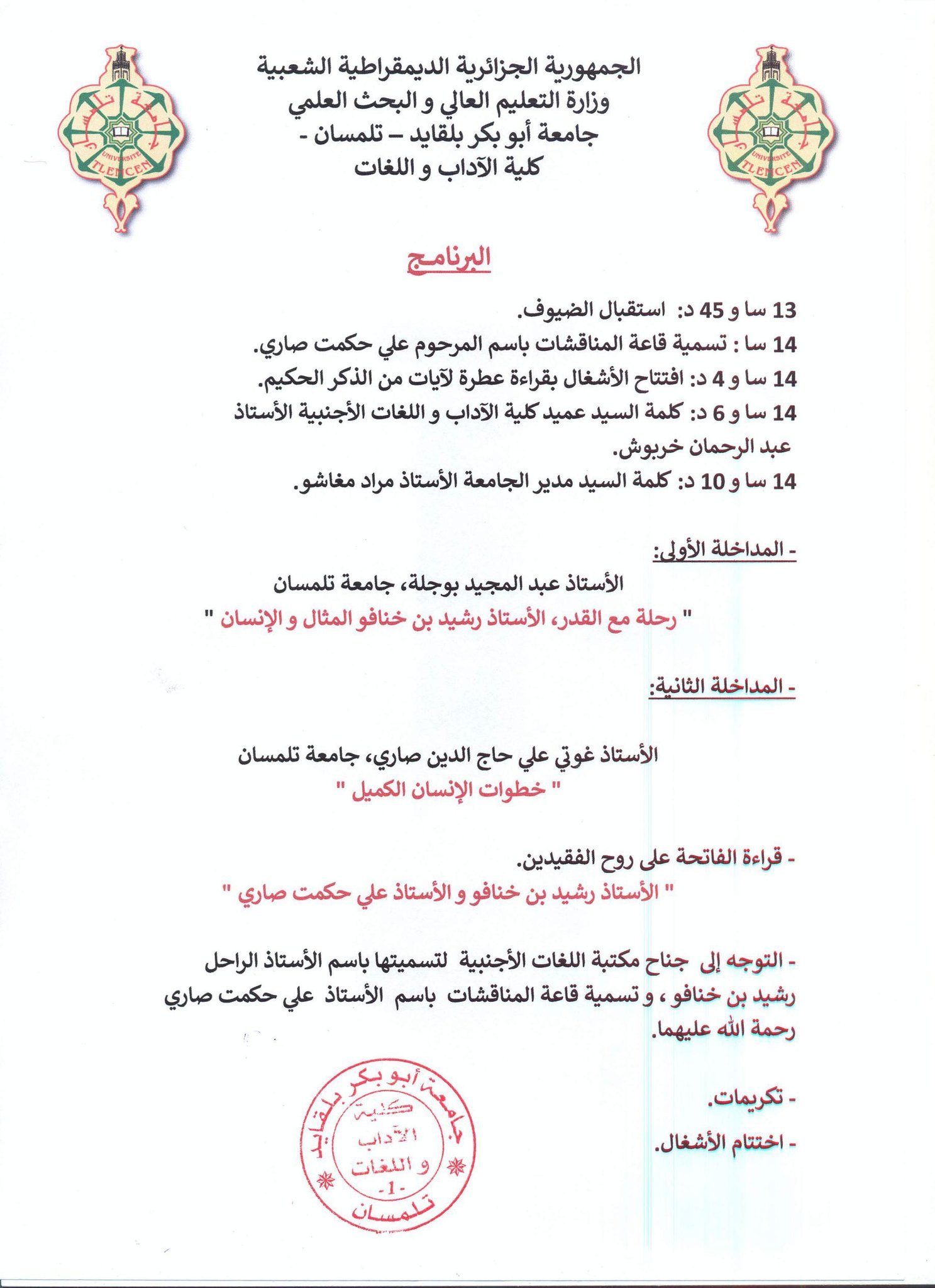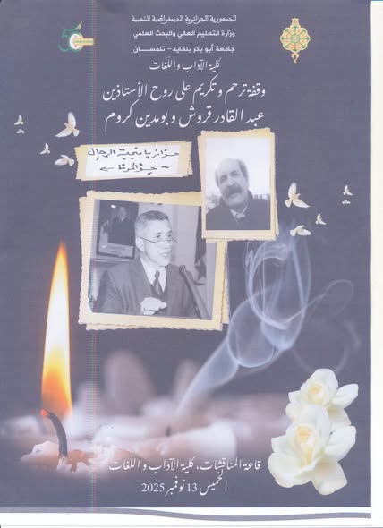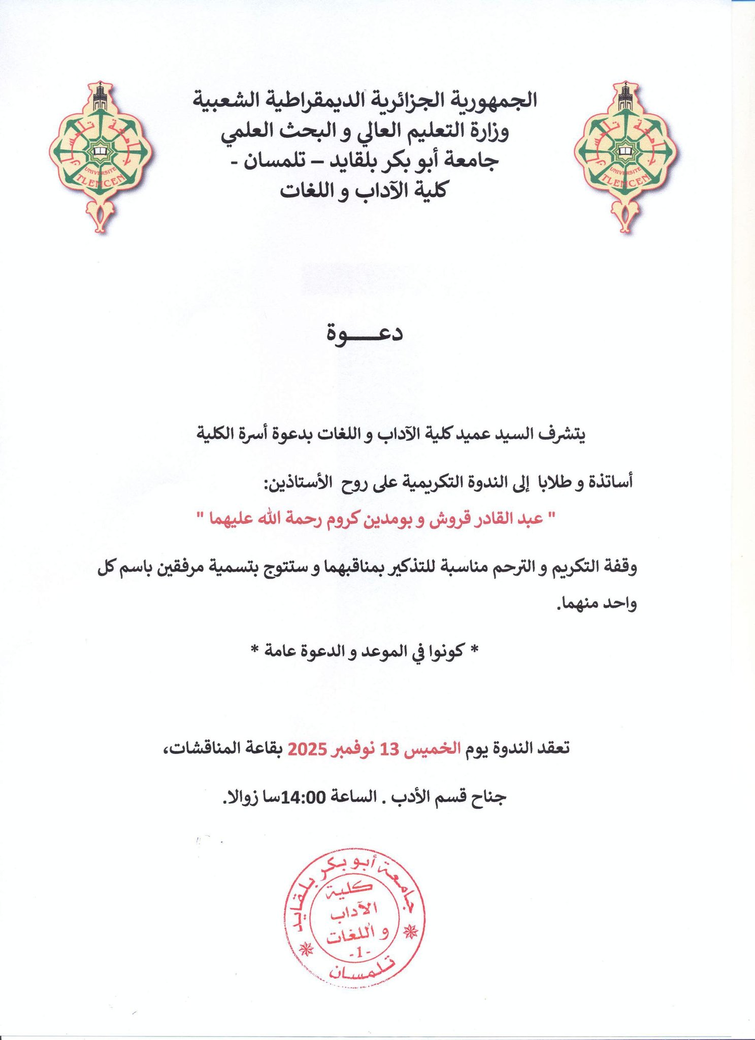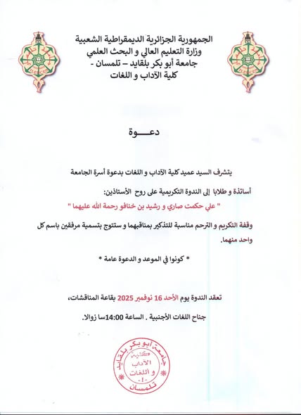 L’événement s’est tenu à la salle de conférences de la Faculté des Langues Étrangères, en présence du Doyen de la Faculté des Lettres et des Langues, Pr. Abderrahmane Kherbouche, de son Adjoint, M. Ben Aïssa Azzedine, ainsi que de Mme Wassila Mouro, Doyenne de la Faculté des Langues Étrangères, ainsi que de plusieurs enseignants- encadrants et d'étudiants de différentes spécialités.